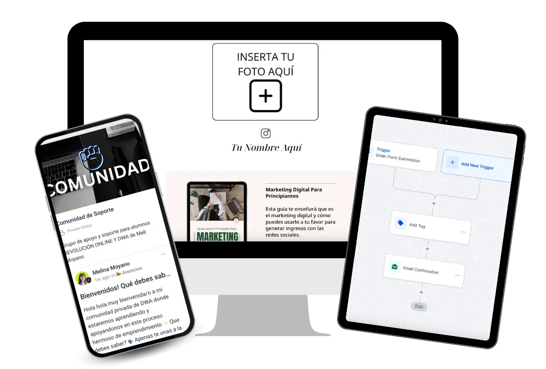 Recibirás una copia exacta de mi negocio online para que puedas comenzar a hacer a dinero rápidamente. Tendrás una web, automatizaciónes, secuencias de emails y mensajes todo hecho para tí (una copia exacta de mi negocio)